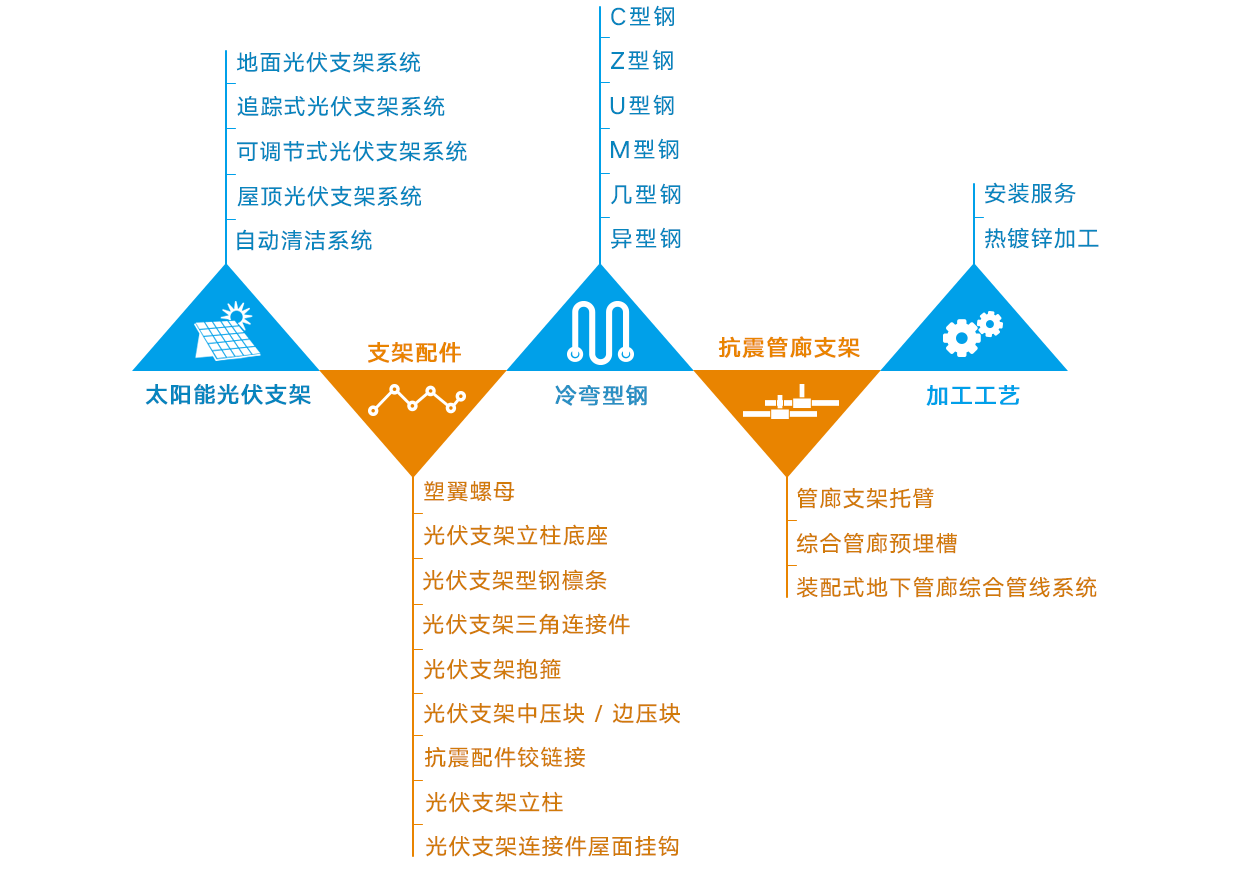 公司始終專注于生產(chǎn)太陽能光伏支架及支架配件(地面支架系統(tǒng)、屋頂支架系統(tǒng)、可調(diào)節(jié)式支架系統(tǒng)、追蹤式支架、自動清潔系統(tǒng)等),C、Z、U、M、幾、異型、等冷彎型鋼,管廊抗震支架、代理熱鍍鋅加工、安裝等服務(wù)。